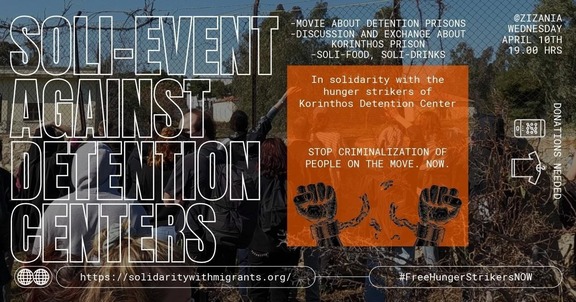 Hunger strikes in Korinthos are on-going. To support the detainees in their struggle against Europe's racist border regime, we will hold a solidarity evening in Zizania on Wednesday 10th at 19pm.