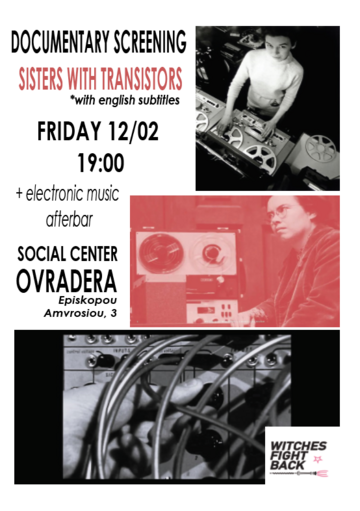 Την Παρασκευή 12/04 από τις 19:00 και μετά σας περιμένουμε στο Κοινωνικό κέντρο Ovradera (Επισκόπου Αμβροσίου 3) για να παρακολουθήσουμε το ντοκιμαντέρ Sisters with Transistors της Lisa Ronver (2020, 86'). Το ντοκιμαντέρ είναι στα Αγγλικά με αγγλικούς υπότιτλους. Μετά την προβολή θα ακολουθήσει electro μπαρ στο χώρο του στεκιού.