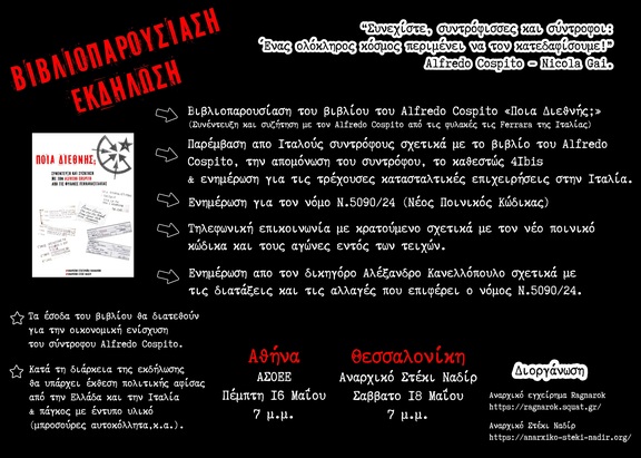 Βιβλιοπαρουσίαση Alfredo Cospito Ποια Διεθνής; εκδηλωση για Νέο Ποινικό Κώδικα