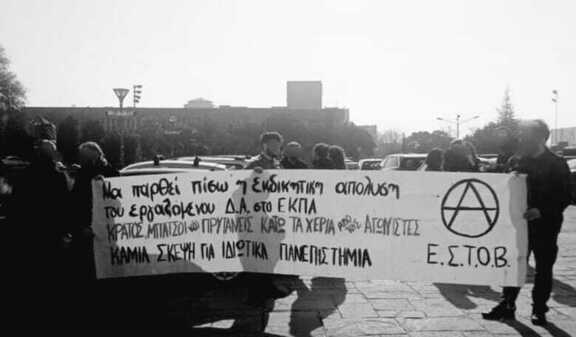 Η εκκένωση της κατειλημμένης (από τους φοιτητικούς συλλόγους Ηλεκτρολόγων Μηχανολόγων και Γεωλογίας) πρυτανείας ΑΠΘ, η εκκένωση της κατειλημμένης σχολής του φοιτητικού συλλόγου Νομικής στην Θράκη και του αντίστοιχου φοιτητικού συλλόγου Νομικής ΑΠΘ (κατόπιν παραγγελίας του Κοσμήτορα Παναγιώτη Γκλαβίνη), η εκκένωση της κατειλημμένης από φοιτητικούς συλλόγους Σχολής Θετικών Επιστημών ΑΠΘ στις 16/03 με 49 συλλήψεις φοιτητών/τριών (με προεξέχον πρόσωπο της καταστολής την Κοσμητόρισσα Χαραλάμπους που αποτελεί και μάρτυρα κατηγορίας απέναντι στους φοιτητές!), τα χημικά, το ξύλο και οι συλλήψεις στις πανεκπαιδευτικές διαδηλώσεις, η κρατική εντολή για πειθαρχικά απέναντι στους αγωνιστές καθώς και η προσπάθεια ακύρωσης του 3ου Διήμερου Αναρχικού Φεστιβάλ στο ΑΠΘ στις 05-06 Απρίλη με τον αποκλεισμό κάθε κεντρικής και παράπλευρης εισόδου του ΑΠΘ από διάφορες κατασταλτικές δυνάμεις της αστυνομίας όπως και η εφαρμογή κλειδώματος (lockout) ολόκληρης της Σχολής Οικονομικών και Νομικών Επιστημών κατόπιν νέας εντολής του Γκλαβίνη και των Πρυτανικών Αρχών όπου μέχρι και η καλεσμένη Γενική Συνέλευση του Σωματείου Εργαζόμενων στην Έρευνα & την Τριτοβάθμια Εκπαίδευση απαγορεύτηκε από τους διάφορους εξουσιομανείς του κρατικού μηχανισμού, αποτελούν μερικούς από τους κρίκους της απεγνωσμένης προσπάθειας κράτους και κυβέρνησης να καταστείλει τους αγώνες φοιτητών και εργαζομένων, να τρομοκρατήσει τους αγωνιστές, να μετατρέψει πλήρως τα πανεπιστήμια σε ένα πεδίο απρόσκοπτης κερδοφορίας επιχειρηματικών συμφερόντων επιβάλλοντας μία συνθήκη σιωπητηρίου και φόβου. Εμείς, τόσο ως εργαζόμενοι/ες αλλά και ως αγωνιστές υπερασπιζόμαστε τον δημόσιο δωρεάν χαρακτήρα της τριτοβάθμιας εκπαίδευσης, αντιμαχόμαστε τους αντικοινωνικούς σχεδιασμούς και τα συμφέροντα κράτους και κεφαλαίου και στεκόμαστε ρητά αλληλέγγυοι σε όλους όσους αγωνίζονται ενάντια στο σάπιο σύστημα εκμετάλλευσης.