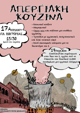Against all these, we call to the streets on 17th of april to fight the constant devaluation of life that this system creates. After the demonstration, we call to collective kitchen, microfoniki and conversation in platia Viktoria, after 15:30. To find each other and break the city's isolation and racist segregation, to build multinational communities, to support each other in the workplace against bosses and in the neighbourhoods against landlords and racists. To create in our neighborhoods grounds for collective resistance against state and capitalist exploitation.
