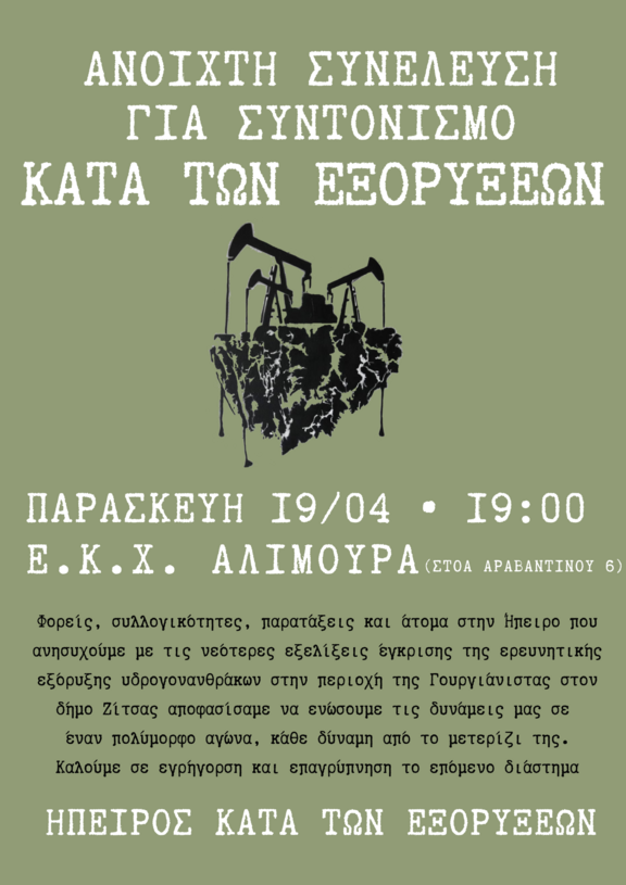 Όσα άτομα βρεθήκαμε στη ανοιχτή συνέλευση συντονισμού στις 9 Απρίλη ανανεώσαμε το ραντεβού μας για την Παρασκευή 19 Απρίλη με σκοπό ένα κοινό κείμενο ενάντια στις εξορύξεις, προσχέδιο του οποίου θα έρθει στη συνέλευση, και καθορισμό ημερομηνίας για πορεία. Είναι σημαντική η εγρήγορσή μας απέναντι στα σχέδια για ερευνητική εξόρυξη που έχουν ήδη εγκριθεί. Καλούμε όσα άτομα και συλλογικότητες ανησυχούν για τις εξελίξεις να πλαισιώσουν το κάλεσμα!