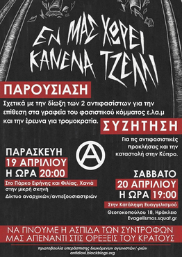 Παρουσίαση σχετικά με τη δίωξη των 2 αντιφασιστών για την επίθεση στα γραφεία του φασιστικού κόμματος ε.λα.μ και την έρευνα για τρομοκρατία. Θα ακολουθήσει συζήτηση για τις αντιφασιστικές προκλήσεις και την καταστολή στην Κύπρο.