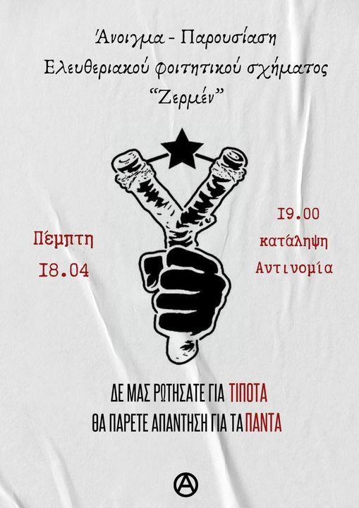 Εκδήλωση παρουσίασης και ανοίγματος του Ελευθεριακού φοιτητικού σχήματος "Ζερμέν"