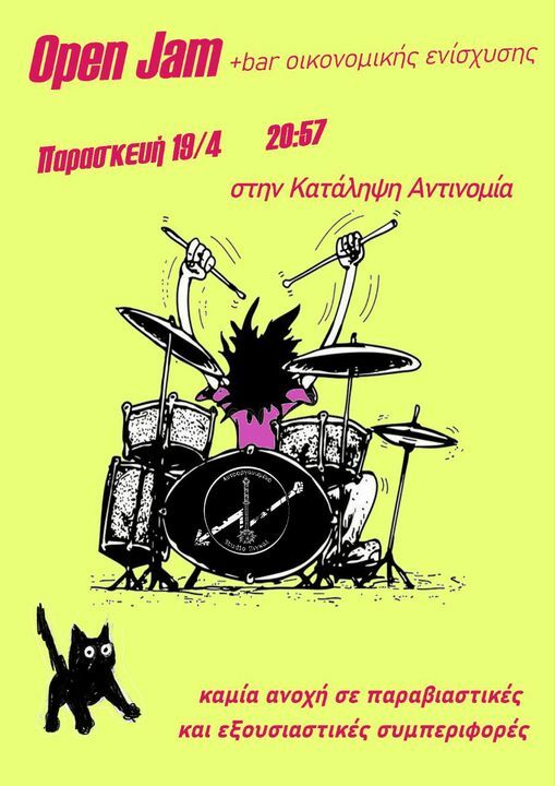 Open jam και bar οικονομικής ενίσχυσης την παρασκεύη 19/4 στο χώρο της κατάληψης Αντινομία στις 20:57.....