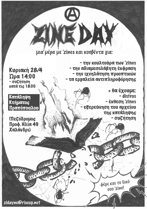 χώρους, μαζευτήκαμε για να οργανώσουμε αυτή την εκδήλωση και προσκαλούμε όποιο ενδιαφέρεται και θα χαρεί να συμμετέχει με ένα distro ή κάποια άλλη πρόταση. Κάποια θέματα που μας ψήνουν: παράνομες και μη κανονιστικές πρακτικές, αγώνες από εδώ και αλλού, ψυχικές συνθήκες/ εμπειρίες, αυτοθεραπεία, απομόνωση σε διάφορες μορφές, καταθέσεις εμπειριών αντιστεκόμενων ατόμων, πώς σχετιζόμαστε με τη φύση, εγχειρίδια και άλλα. Στηρίζουμε ποικίλους τρόπους γραψίματος και δε θέλουμε να περιορίσουμε τη διαδικασία του να γραψίματος ή τυπώμανος ενός ζην σε συγκεκριμένα στάνταρς. Συνεπώς χειρόγραφα, δακτυλογραφημένα,