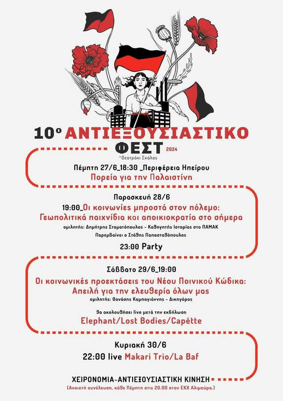 Στο 10ο Αντιεξουσιαστκό Φεστιβάλ θα ασχοληθούμε ποικιλοτρόπως με τα παραπάνω ζητούμενα. Την Πέμπτη στις 27/6, δίνουμε ραντεβού στην Περιφέρεια Ηπείρου, στις 18:30, για να βγούμε στο δρόμο και να φωνάξουμε πως από την Ουκρανία μέχρι την Παλαιστίνη όσο υπάρχουν κράτη δεν θα υπάρχει ειρήνη και να εκφράσουμε την αλληλεγγύη μας προς τον παλαιστινιακό λαό. Την επόμενη μέρα, Παρασκευή 28/6, στις 19:00, στο Θεατράκι Σκάλας, θα αναλύσουμε το πολεμικό ζήτημα στο σήμερα, ενώ το Σάββατο 29/6, στις 19:00, στο ίδιο μέρος, θα δούμε τις κοινωνικές προεκτάσεις του Νέου Ποινικού Κώδικα που αποτελούν απειλή για την ελευθερία όλων μας.