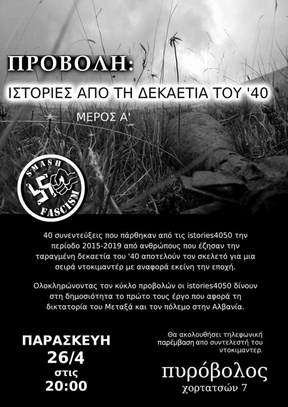 40 ΠΡΟΣΩΠΑ ΑΠΟ ΤΗ ΔΕΚΑΕΤΙΑ ΤΟΥ '40 - Καθεστώς 4ης Αυγούστου & Ελληνοϊταλικός πόλεμος [2020] Οι istories4050 παρουσιάζουν στα πλαίσια της σειράς ντοκυμαντέρ «40 faces of the 40s» για τη δεκαετία του '40, το πρώτο μέρος με τίτλο «ΚΑΘΕΣΤΩΣ 4ης ΑΥΓΟΥΣΤΟΥ - Ε.Ο.Ν. & ΕΛΛΗΝΟΙΤΑΛΙΚΟΣ ΠΟΛΕΜΟΣ». 40 συνεντεύξεις που πάρθηκαν από τις istories4050 την περίοδο 2015-2019 από ανθρώπους που έζησαν την ταραγμένη δεκαετία του '40 αποτελούν τον σκελετό για μια σειρά ντοκιμαντέρ με αναφορά εκείνη την εποχή. Ολοκληρώνοντας τον κύκλο προβολών οι istories4050 δίνουν στη δημοσιότητα το πρώτο τους έργο που αφορά τη δικτατορία του Μεταξά και τον πόλεμο στην Αλβανία.