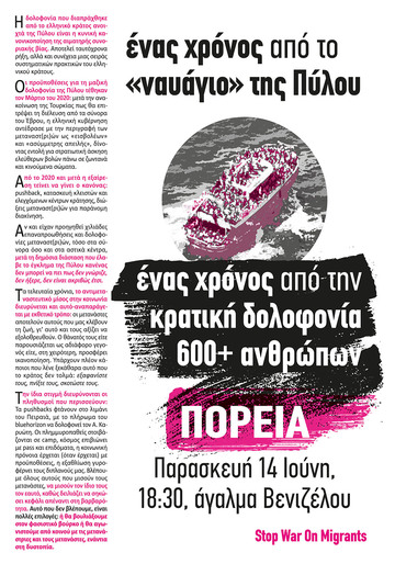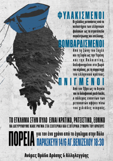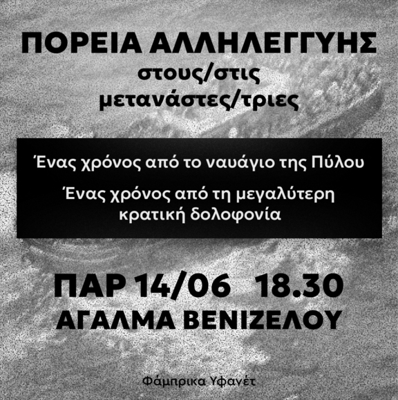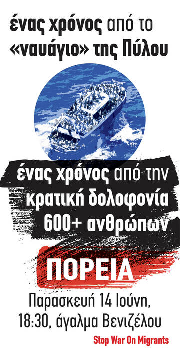 Ένα χρόνο λοιπόν μετά το ναυάγιο στην Πύλο βγαίνουμε ξανά στο δρόμο. Βγαίνουμε στο δρόμο για τα ναυάγια που προηγήθηκαν και για να μην έρθουν άλλα στο μέλλον. Στο δρόμο μαζί με τις μετανάστριες και επιθετικά ενάντια στον εθνικό κορμό. Για να δούμε πέρα από τις εικόνες των πνιγμένων σωμάτων που ξεβράζονται στις ακτές, πέρα από τα σχόλια στα social media. Για να δούμε, ντόπιες και μετανάστριες, αυτό που μας ενώνει. Όχι ο θάνατος, αλλά ο αγώνας για μια καλύτερη ζωή.