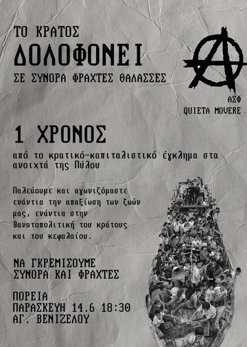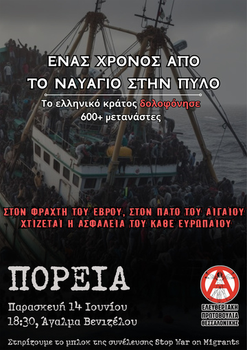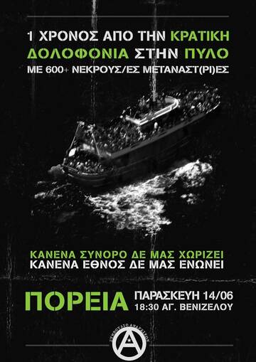 1 χρόνο μετά την δολοφονία πολλών εκατοντάδων μεταναστ(ρι)ών, από την σκόπιμη αδιαφορία των λιμενικών αρχών, που για πάνω από 16 ώρες είχαν ενημερωθεί ότι αυτοί οι άνθρωποι κινδύνευαν και επέλεγαν να μην τους διασώσουν. 1 χρόνο μετά το πολύνεκρο ναυάγιο της Πύλου στο οποίο έχασαν τη ζωή τους πάνω από 600 άνθρωποι, το ταξικό μας καθήκον είναι η έμπρακτη αλληλεγγύη στους επιζώντες και τις οικογένειες των νεκρών, όπως επίσης οφείλουμε να τιμήσουμε τη μνήμη των νεκρών δολοφονημένων μεταναστών, δυναμώνοντας τους αγώνες και στοχοποιώντας τους πραγματικούς ενόχους αυτού του φριχτού εγκλήματος, που δεν είναι παρά το λιμενικό, η Frontex, η ΕΕ, το ΝΑΤΟ και το ελληνικό κράτος.