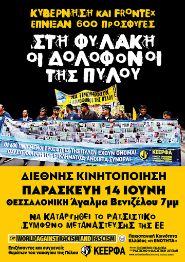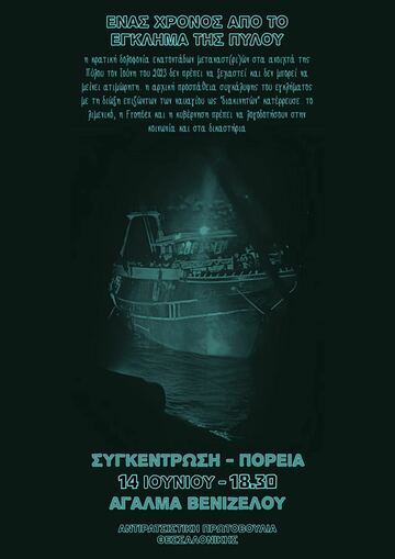 Για να μην περάσει η συγκάλυψη τους εγκλήματος της Πύλου, να τιμωρηθούν οι δολοφόνοι, δικαίωση των θυμάτων του ναυαγίου της Πύλου! Για ανοιχτά σύνορα για την προσφυγιά, άσυλο και χαρτιά σε μετανάστες και πρόσφυγες.