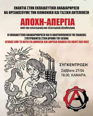 Αυτή η ζοφερή πραγματικότητα μπορεί να απαντηθεί μόνο μέσα από τον ακηδεμόνευτο συλλογικό αγώνα των ίδιων των εργαζόμενων, εκπαιδευτικών, μαθητών και φοιτητών, με οργάνωση στη βάση με ελευθεριακά χαρακτηριστικά και από τα κάτω. Ούτε βήμα πίσω σε αυτά που έχουμε κατακτήσει και που διαρκώς διακυβεύονται. Με συλλογικές διαδικασίες, γενικές συνελεύσεις, καταλήψεις, απεργίες, διαδηλώσεις, συγκρούσεις αγωνιζόμαστε ώστε να δώσουμε στους χώρους εργασίας, σε σχολεία και σχολές τη μάχη του ταξικού και κοινωνικού αγώνα. Αγωνιζόμαστε ενάντια στην υποτίμηση και εξαθλίωση της ζωής μας, ενάντια στο εκμεταλλευτικό και δολοφονικό σύστημα που καταδυναστεύει τις ζωές μας.