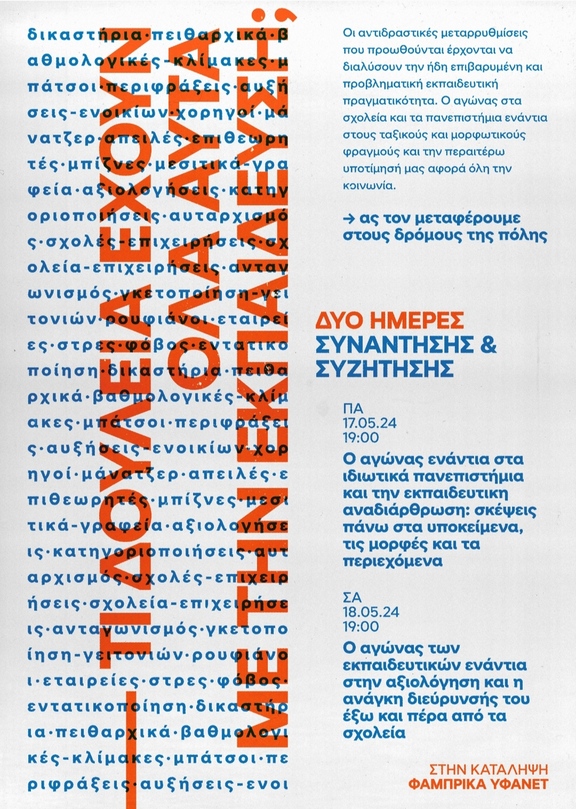 Εκδήλωση-Συζήτηση: "Αγώνας ενάντια στα ιδιωτικά πανεπιστήμια και στην εκπαιδευτική αναδιάρθρωση: σκέψεις πάνω στα υποκείμενα,τις μορφές και τα περιεχόμενα του αγώνα"