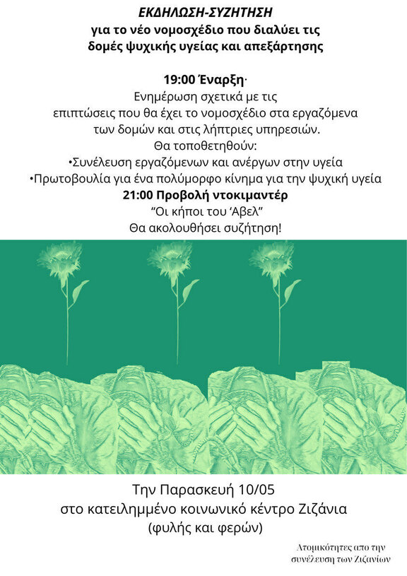Εκδήλωση - Συζήτηση για το νέο νομοσχέδιο που διαλύει τις δομές ψυχικής υγείας και απεξάρτησης