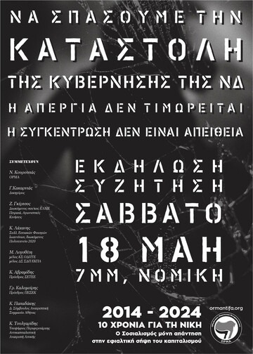 Με αφορμή αυτή τη δίωξη, η ΟΡ.Μ.Α. διοργανώνει πολιτική εκδήλωση - συζήτηση το Σάββατο 18 Μάη, στη Νομική Αθηνών στις 7μμ, με θέμα την εκτεταμένη κυβερνητική καταστολή και την επιχείρηση τρομοκράτησης του κινήματος, μέσα από απαγορεύσεις - συλλήψεις - διώξεις - εισαγγελικές παραγγελίες, απέναντι σε απεργίες - διαδηλώσεις - καταλήψεις - αποχή, και πώς μπορεί να την αντιμετωπίσει η εργατική τάξη σήμερα υπερασπιζόμενη τα δικαιώματα της απεργίας της συγκέντρωσης χωρίς περιορισμούς και αστυνομικούς ελέγχους. Θα μιλήσουν οι: Ν. Κουρουπάς (ΟΡ.Μ.Α.), Γ. Κακαρνιάς (Δικηγόρος), Ζ. Γκέρτσος (διωκόμενος εκπαιδευτικός ΕΛΜΕ Πειραιά, Αγωνιστικές Κινήσεις), Κ. Λάχανης (Σύλλογος Εστιακών Φοιτητών Ιωαννίνων, διωκόμενος Πολυτεχνείο 2020), Μ. Λογοθέτη (μέλος ΚΣ της Ομοσπονδίας Διοικητικού Προσωπικού Τριτοβάθμιας Εκπαίδευσης, μέλος ΔΣ του Συλλόγου Διοικητικού Προσωπικού ΕΚΠΑ), Κ. Αβραμίδης (Πρόεδρος Συλλόγου Εργαζομένων Τεχνικού Επιμελητηρίου Ελλάδας), Γρ. Καλομοίρης (Πρόεδρος Πανελλήνιας Ένωσης Συνταξιούχων Εκπαιδευτικών), Κ. Παπαδάκης (Δημοτικός Σύμβουλος «Ανατρεπτική Συμμαχία για την Αθήνα»), Κ. Τουλγαριδης (Υποψήφιος Περιφερειάρχης «Αντικαπιταλιστική Ανατροπή στην Αττική»).