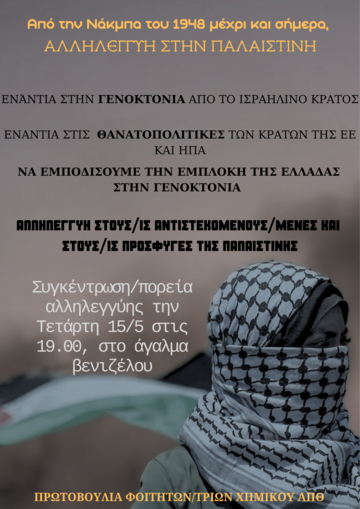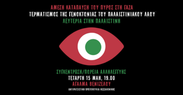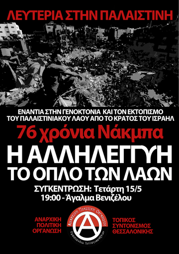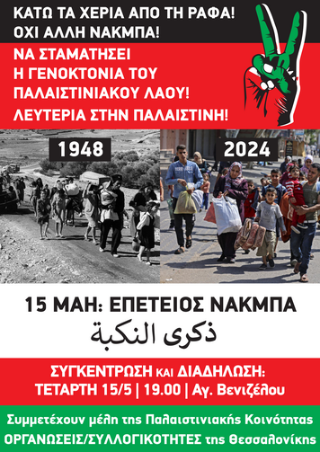Με αφορμή την επέτειο της Νάκμπα του 1948, βγαίνουμε στον δρόμο και φωνάζουμε με όλη μας τη δύναμη για μια ελεύθερη Παλαιστίνη, για άμεση κατάπαυση του πυρός στη Γάζα, για τερματισμό της γενοκτονίας του Παλαιστινιακού λαού!