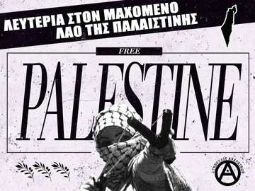 Το ελληνικό κράτος φυσικά δεν μένει αμέτοχο στην γενοκτονία που εξελίσσεται τους τελευταίους μήνες. Πλήρως εναρμονισμένο στις επιταγές του ΝΑΤΟ και του Ισραήλ, στηρίζει υλικά και ηθικά τις επιχειρήσεις, ασκώντας προπαγάνδα ενάντια στους "τρομοκράτες της Χαμάς" και μιλώντας για δικαίωμα στην αυτοάμυνα του Ισραήλ.Το στρατόπεδο στην Λάρισα χρησιμοποιείται ως κέντρο επιχειρήσεων κατά των ανταρτών Χουθι στην ερυθρά θάλασσα ενώ έχει ήδη σταλεί ελληνική φρεγάτα ( Ύδρα ) που επιχειρεί εναντίον των Χουθι. Το ελληνικό κράτος είναι συνένοχο στην καταστροφή υποδομών υγείας και παιδείας, στις μαζικές δολοφονίες, στην συνεχόμενη προσπάθεια αφανισμού του παλαιστινιακού λαού και πως να μην ήταν άλλωστε μιας και η συνεργασία του με το κράτος του Ισραήλ είναι διαχρονική. Από το Κοινό Σχέδιο Δράσης των ένοπλων δυνάμεων Ελλάδας-Κύπρου-Ισραήλ μέχρι τις επενδύσεις στον τομέα της έρευνας και ανάπτυξης των πολεμικών βιομηχανιών το ελληνικό κράτος είναι ΣΥΝΕΝΟΧΟ!