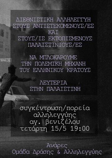 Για εμας είναι υποχρέωση να μπλοκάρουμε τη στρατιωτική συμμετοχή του ελληνικού κράτους που στο παρόν συμμετέχει ενεργά στη γενοκτονία ολόκληρου λαού. Είναι υποχρέωση μας να σταθούμε αλληλέγγυοι σε κάθε παλαιστίνιο/α πρόσφυγα/ισσα και στον εκάστοτε καταπιεσμένο πληθυσμό, απέναντι σε κάθε βάναυση πολιτική κυριαρχίας των επιτιθέμενων κρατών-εθνών και των συμφερόντων τους.