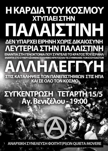 Οι συνθήκες λοιπόν επιβάλλουν την δράση μας και την αλληλεγγύη μας, την δέσμευσή μας για κλιμάκωση στο όνομα της απελευθέρωσης των Παλαιστινίων και του αγώνα παγκοσμίως ενάντια στην αποικιοκρατία και τον ιμπεριαλισμό. Στεκόμαστε αλληλέγγυοι και αλληλέγγυες με τις μαζικές αντιπολεμικές κινητοποιήσεις των φοιτητών παγκοσμίως . Με κινητήριο μοχλό το ριζοσπαστικό κύμα καταλήψεων και διαδηλώσεων που έχει ξεσπάσει σε παγκόσμιο βαθμό, οφείλουμε και εδώ να θέσουμε τα εναρκτήρια θεμέλια ενός μαζικού αγώνα με στόχο την άμεση απεμπλοκή της ελληνικής πολεμικής μηχανής και πρόταγμα την ολική απελευθέρωση των λαών από εθνικό- κρατικά συμφέροντα, θρησκευτικούς φανατισμούς και ρατσιστικές μισαλλοδοξίες. Μέχρι να δομήσουμε έναν κόσμο που θα μας χωράει όλους, μέχρι την ολική κοινωνική απελευθέρωση.