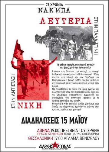 Ενάντια στη Νάκμπα, ενάντια στην κατοχή, τη συνεχή διαδικασία επικοισμού στα Παλαιστινιακά εδάφη, ενάντια στη σφαγή και τον ξεριζωμό των Παλαιστινίων, η φετινή 15η Μάη οφείλει να βρει το αντιπολεμικό και αντιιμπεριαλιστικό κίνημα στον δρόμο. Να πυροδοτήσει εκ νέου ένα κύμα αγώνων και αλληλεγγύης υπέρ του παλαιστινιακού λαού και να μπλοκάρει οποιαδήποτε συμμετοχή και συνεργασία του ελληνικού κράτους με το κράτος δολοφόνο του Ισραήλ. Γιατί ακριβώς η φετινή 15η Μάη αποτελεί μέρα αντίστασης και ελπίδας για όλους τους λαούς του κόσμου που αγωνίζονται ενάντια στον ιμπεριαλισμό και τον φασισμό.