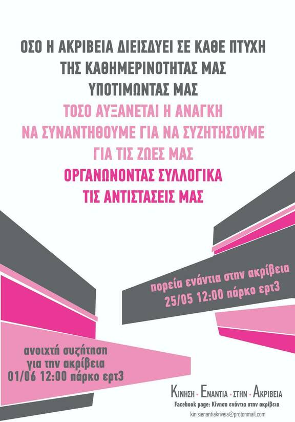 Η ακρίβεια είναι κάτι που μας ακουμπάει όλους, και όλοι γκρινιάζουμε για αυτή. Είναι σημαντικό όμως αυτή η ατομικοποιημένη γκρίνια να βγει από τις κουζίνες των σπιτιών, να συναντηθεί με άλλες και να μετατραπεί σε συλλογική διεκδίκηση. Στα συλλογικά προβλήματα δε χωράνε ατομικές λύσεις. Χρειάζεται να βρεθούμε και να παλέψουμε μαζί στις γειτονιές, στους χώρους εργασίας, στους χώρους που υπάρχουμε καθημερινά. Σας καλούμε, λοιπόν, το Σάββατο 01/06 στις 12:00 στο πάρκο της ΕΡΤ3 να συζητήσουμε για τα αδιέξοδα που βιώνουμε στην καθημερινότητα μας, για το πώς θα καταφέρουμε να διεκδικήσουμε μείωση στις τιμές των super market, για το πώς θα μπορέσουμε να δημιουργήσουμε δομές αλληλοβοήθειας και κοινότητες αγώνα στις γειτονιές, απέναντι στην κρίση.