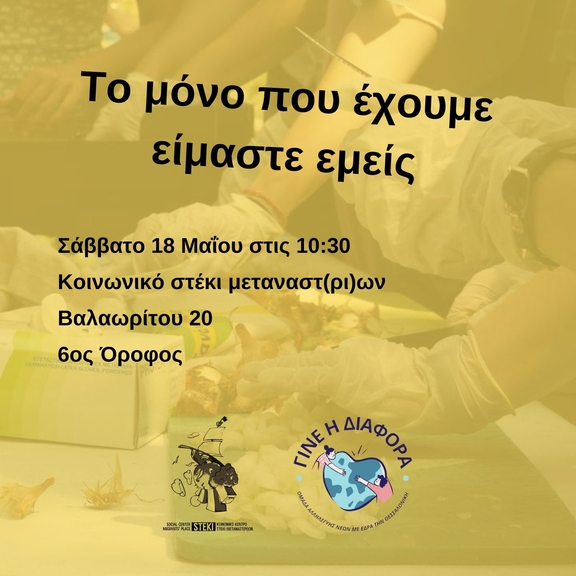 Το Σάββατο 18 Μαΐου στις 11:00 θα μαγειρέψει η ομάδα του Γίνε η Διαφορά στο Κοινωνικό στέκι μεταναστ(ρι)ων στην Βαλαωρίτου 20.