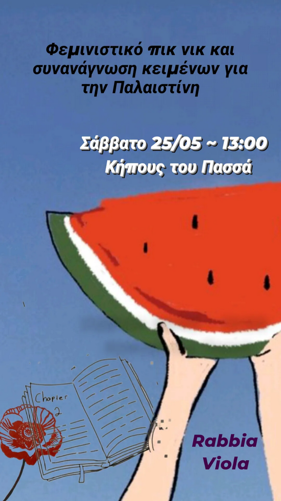 Αυτό το Σάββατο 25/05, 13.00-16.00 θα μαζευτούμε στους Κήπους του Πασά για ένα φεμινιστικό πικ νικ έχοντας μαζί μας κάποια αναγνώσματα από θηλυκότητες και queer άτομα επάνω στο βίωμα του πολέμου και του διωγμού στην Παλαιστίνη. Παρακολουθώντας τον πόλεμο και την γενοκτονία που συνεχίζεται τόσους μήνες, νιώσαμε την ανάγκη να μαζευτούμε, να μοιραστούμε σκέψεις και συναισθήματα, να ανταλλάξουμε ιδέες και να ενισχύσουμε την αληλλεγγύη μας μέσα από τις λέξεις και τις εμπειρίες των ίδιων των ατόμων που βιώνουν αυτές τις συνθήκες. Η συνανάγνωση θα βασιστεί κυρίως σε αποσπάσματα από το βιβλίο "Συνεντεύξεις με ριζοσπάστριες παλαιστίνιες γυναίκες" καθώς και αποσπάσματα και ποιήματα από περιοδικά όπως το ΤΕΦΛΟΝ κ.α. Όποια άτομα επιθυμούν μπορούν να φέρουν και τα ίδια κείμενα που θέλουν να μοιραστούν.