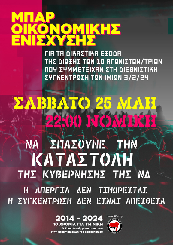 για τα δικαστικά έξοδα της δίωξης των 10 αγωνιστών/ριών που συμμετείχαν στη διεθνιστική συγκέντρωση των Ιμίων 3/2/24