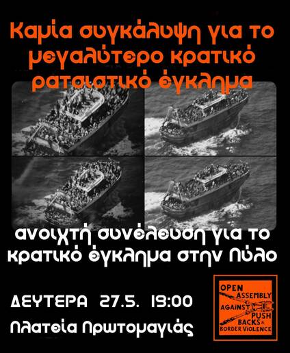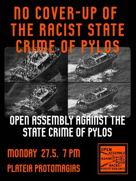 We call for an Οpen Αssembly Against the State Crime at Pylos, on Monday 27 May 2024 at 7pm in Protomagias Square.