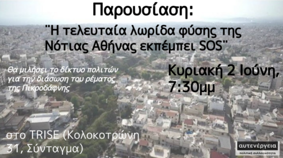 Σε συνέχεια των δράσεων μας για την υπεράσπιση των ελάχιστων εναπομείναντων φυσικών τοπίων μέσα στον Αθηναικό αστικό ιστό την Κυριακή 2 Ιουνίου στις 19:30 θα γίνει παρουσίαση στην ταράτσα του Trise από τα μέλη του δικτύου πολιτών για τη διάσωση του ρέματος της πικροδάφνης με τίτλο ¨Η τελευταία λωρίδα φύσης στη Νότια Αθήνα εκπέμπει SOS¨.