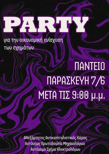 Ως αυτόργανωμένα σχήματα κοινωνικού χώρου ο τρόπος που βγάζουμε χρήματα για την καθημερινή μας ύπαρξη εντός των πανεπιστημίων είναι μέσα από πάρτι και εκδηλώσεις οικονομικής ενίσχυσης. Έτσι και σε αυτό το πάρτι βγάζουμε τα υλικά μας και σταματάμε να χρωστάμε σε φωτοτυπίες και λινατσες και παρταρουμε φροντιστικα και συλλογικά. Ακούμε μουσικές και πίνουμε ποταρες φροντίζοντας τον χώρο και τα άτομα γύρω μας.