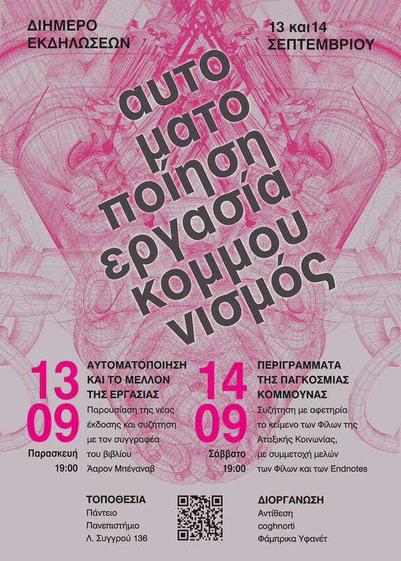 Διήμερο εκδηλώσεων: "Αυτοματοποίηση, Εργασία, Κομμουνισμός". Παρουσίαση της έκδοσης: "Αυτοματοποίηση και το μέλλον της εργασίας" με τον Άαρον Μπέναναβ και συζήτηση με αφορμή το κείμενο των Φίλων της Αταξικής Κοινωνίας: "Περιγράμματα για την παγκόσμια κομμούνα" με συμμετοχή μελών των Φίλων και των Endnotes.