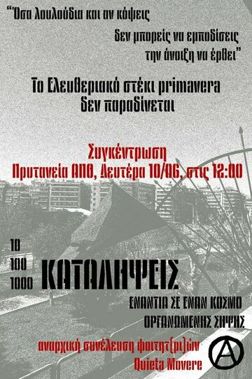 Εμείς από τη πλευρά μας, δείχνουνε την αμέριστη αλληλεγγύη μας στο primavera, τα ζιζάνια, το στέκι Γεωλογικού και τον χώρο της ΘΟΦ, το στέκι μαθηματικου, σε όσους δέχονται την κρατική καταστολή και σε όλες τις καταλήψεις εντός και εκτός των πανεπιστημιων που δέχονται την κρατική επίθεση. Κατανοούμε σε βάθος πως η επιλογή της κατάληψης είναι ένα εργαλείο επικίνδυνο για το κράτος και για αυτό συνεχώς ερχόμαστε αντιμέτωποι με την καταστολή των κατειλημμένων χωρων. Συνεχίζουμε να υπερασπιζόμαστε τις δομές αγωνα και το άσυλο και να δημιουργούμε τις ρωγμές μέσα από τις οποίες θα γεννηθεί ο κόσμος του αύριο!