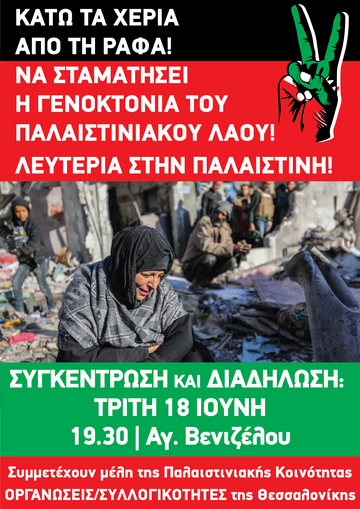 Καλούμε όλο τον κόσμο, τους εργαζόμενους, τους φοιτητές, και όλους τους αλληλέγγυους. Να μη μείνουμε άπραγοι μπροστά σε μια νέα γενοκτονία που αυτή τη στιγμη συμπράττεται στη Παλαιστίνη.