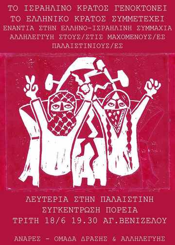 Στην γενοκτονία που διαπράττει το ισραηλινό κράτος συναινεί και συμμετέχει και το ελληνικό κράτος μεταξύ άλλων. Η εδραίωση και η εξάπλωση της κυριαρχίας του ελληνικού κράτους στην ευρύτερη νοτιοανατολική Μεσόγειο αποτυπώνεται και περνάει μέσα από την άμεση εμπλοκή του στη γενοκτονία των Παλαιστινίων από το κράτος του Ισραήλ, αλλά και τις ευρύτερες συγκρούσεις στη μέση Ανατολή. Οι στρατιωτικές βάσεις χρησιμοποιούνται σαν ορμητήρια βομβαρδισμών αμάχων, η Λάρισα θα αποτελέσει/αποτελεί στρατηγείο κατά των Χούθι ενώ η φρεγάτα Ύδρα ήδη πολεμά στη μέση Ανατολή. Η σύνδεση εξ άλλου με το κράτος του Ισραήλ γίνεται οικονομικά, ερευνητικά και στρατιωτικά, και επιβεβαιώνεται μεταξύ άλλων από τις διμερείς συμφωνίες. Στις 27/5, πραγματοποιήθηκε κοινή άσκηση ελληνικών και ισραηλινών αεροπορικών δυνάμεων, νότια της Κρήτης, εν μέσω του γενοκτονικού πολέμου. Η ύπαρξη, επίσης, ελληνικής πυροβολαρχίας (με πυραύλους patriot) στην Σαουδική Αραβία, οι στρατιωτικές και ενεργειακές συμφωνίες με αυτήν, συνεπάγουν και ενεργό συμμετοχή και συναίνεση στο χρόνιο εμπάργκο της Σ. Αραβίας εναντίον της Υεμένης και της τεράστιας ανθρωπιστικής κρίσης/λιμού που έχει προκληθεί στους κατοίκους της. Το ελληνικό κράτος από τη μία πολεμάει με σκοπό την υπεράσπιση του εγχώριου κεφαλαίου (εφοπλιστικό κεφάλαιο, ενεργειακές συμφωνίες κλπ) και προς εξασφάλιση των διακρατικών του συμμαχιών - Ε.Ε.,ΝΑΤΟ, διμερείς συμφωνίες με Ισραήλ, Σ. Αραβία κλπ. Ενώ από την άλλη μέσω της εξωτερικής πολιτικής του (συνέδριο MED5) προτείνει και διαμορφώνει πολιτικές εναντίον των μεταναστ(ρι)ών στις υπόλοιπες χώρες τις Ευρώπης, διεξάγει πόλεμο κατά των μεταναστ(ρι)ών, επιδιώκοντας την τιθάσευση και ομοιογένεια (προς το συμφέρον του) στο εσωτερικό του.