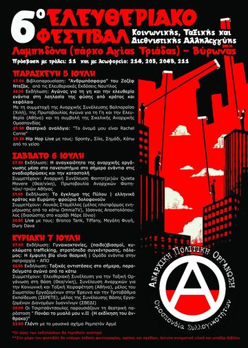 Στα πλαίσια του 6ου Ελευθεριακού Φεστιβάλ Κοινωνικής, Ταξικής & Διεθνιστικής Αλληλεγγύης της Αναρχικής Πολιτικής Οργάνωσης - Ο.Σ.