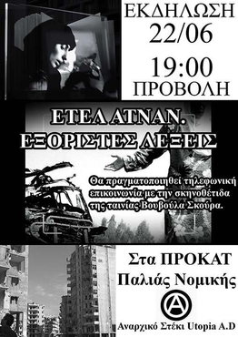 ΕΚΔΗΛΩΣΗ-ΠΡΟΒΟΛΗ: BΟΥΒΟΥΛΑ ΣΚΟΥΡΑ «ΕΤΕΛ ΑΤΝΑΝ. ΕΞΟΡΙΣΤΕΣ ΛΕΞΕΙΣ» Το Σάββατο 22/06 και ώρα 19:00. Θα πραγματοποιηθεί τηλεφωνική επικοινωνία με την σκηνοθέτιδα Βουβούλα Σκούρα. ΠΡΟΚΑΤ παλιάς νομικής.