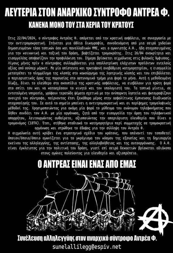 Η αιχμαλωσία αυτή κρύβει στον πυρήνα της ένα ολόκληρο στρατηγικό σχέδιο του κράτους, που απέναντί του τοποθετεί όποια αγωνίζεται για το γκρέμισμα του κόσμου της εξουσίας και τη δημιουργία εκείνου της αλληλεγγύης, της αντίστασης, της αλληλοβοήθειας και της αυτοοργάνωσης. Το σχήμα είναι απλό. Κάθε φωνή αντίστασης θα πνιγεί πάση θυσία, κάθε αγωνιστής θα φιμωθεί και θα πεταχτεί -αν περισσεύει ή ανενοχλεί πολύ- στα μπουντρούμια της δημοκρατίας και όποιο τολμάει να σηκώσει κεφάλι, μη ακολουθώντας πειθήνια ό,τι ορίζει η κυριαρχία, θα τσακίζεται. Έτσι, λοιπόν και ο Α.Φ. είναι έγκλειστος για την πολιτική του δράση, γιατί επί σειρά δεκαετιών βρίσκεται αδιάκοπα στους αγώνες παλεύοντας για ελευθερία και αξιοπρέπεια. Από τις φοιτητικές κινητοποιήσεις του 2006-2007 και την αλληλεγγύη στους μετανάστες/τριες, στην εξέγερση του 2008 και το καταληψιακό κίνημα της Πάτρας, από τους Αγανακτισμένους και τις λαϊκές συνελεύσεις γειτονιάς, στην αλληλεγγύη στους διωκόμενους/ες αγωνιστές/τριες και τον αντιφασιστικό αγώνα, από τις κινητοποιήσεις ενάντια στα μνημόνια και τις απεργίες, στις δομές αλληλοβοήθειας και τις συλλογικές κουζίνες, από τους αγώνες ενάντια στην λεηλασία της φύσης και των ζωών μας στις ανοιχτές συνελεύσεις και τις εργατικές ομάδες, από πρωτοβουλίες ενάντια στην ακρίβεια και συνελεύσεις ενάντια στις εξορύξεις, σε πρωτοβουλίες που είχαν ως στόχο την υποστήριξη συνανθρώπων μας που είχαν πληγεί από φωτιές ή πλημμύρες και την κρατική αδιαφορία. Ο Αντρέας, ένας αναρχικός κοινωνικός αγωνιστής, συνειδητά έχει επιλέξει τον δρόμο του αγώνα στο πλάι των αδικημένων αυτού του κόσμου, του αγώνα ενάντια στην εκμετάλλευση, ενάντια στους καταστροφικούς σχεδιασμούς του κράτους και του κεφαλαίου, με την αντίσταση, την αυτοοργάνωση και την αλληλεγγύη ως όπλο. Η δίωξη του είναι πολιτική και έρχεται να προστεθεί στις τόσες εκδικητικές διώξεις αγωνιστών που στάθηκαν και στέκονται απέναντι στον κόσμο της εξουσίας.