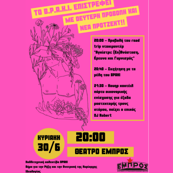 Μετά τη μεγάλη επιτυχία της πρεμιέρας, το "Αγκίστρι" επιστρέφει! Ελάτε για τη δεύτερη προβολή αυτού του road trip documentary, καθώς επίσης και για να συζητήσουμε, να διασκεδάσουμε και να μαζέψουμε οικονομική ενίσχυση για τα έξοδα φυλομετάβασης! Στο πάρτυ που θα ακολουθήσει την προβολή, θα παίξει μουσική ο θρυλικός DJ Robert!