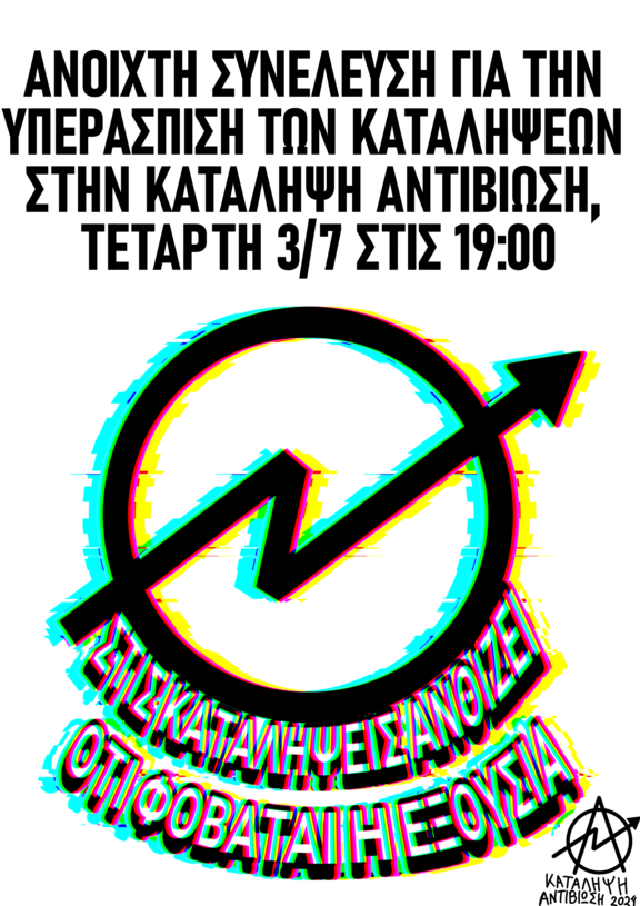 Με αφορμή το μπαράζ κρατικών επιθέσεων ενάντια στις καταλήψεις, καθώς και τις κυβερνητικές απειλές για εκκενώσεις μέσα στο καλοκαίρι καλούμε σε ανοιχτή συνέλευση υπεράσπισης των καταλήψεων. Θεωρούμε απαραίτητο να συσπειρώσουμε τις δυνάμεις μας όσος κόσμος αντιλαμβανόμαστε τις καταλήψεις ως ζωτικούς χώρους του κινήματος ώστε ν' απαντήσουμε δυναμικά και συντονισμένα για να συνεχίσουμε να υπάρχουμε πολιτικά.