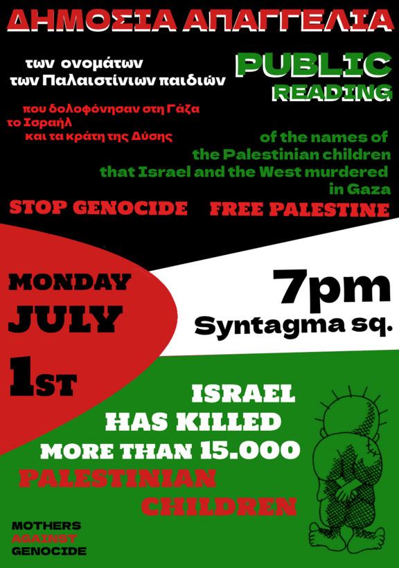 Δημόσια απαγγελία των ονομάτων των παλαιστίνιων παιδιών που δολοφόνησαν στη Γάζα το Ισραήλ και τα συνένοχα κράτη της Δύσης.