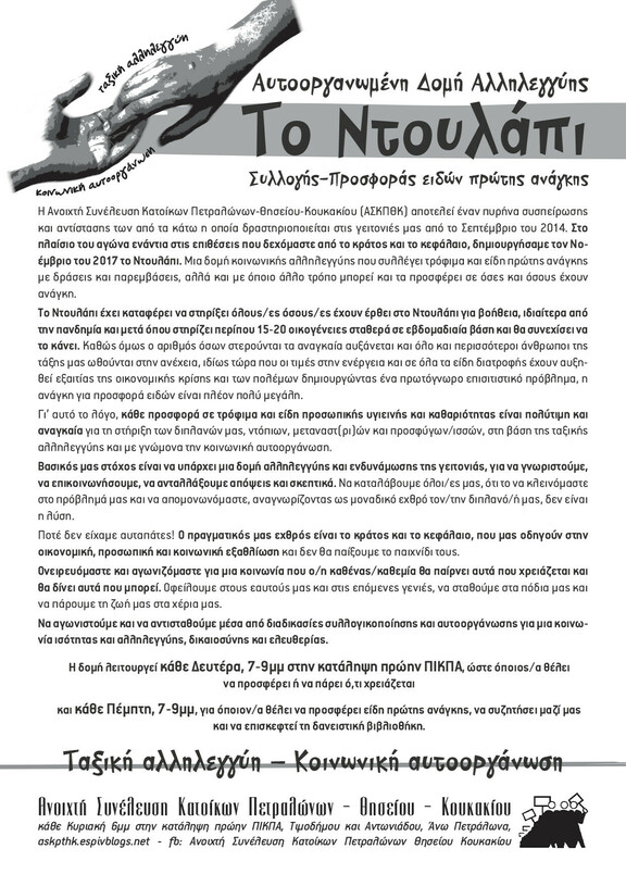 Η Ανοιχτή Συνέλευση Κατοίκων Πετραλώνων-Θησείου-Κουκακίου (ΑΣΚΠΘΚ) αποτελεί έναν πυρήνα συσπείρωσης και αντίστασης των από τα κάτω η οποία δραστηριοποιείται στις γειτονιές μας από το Σεπτέμβριο του 2014. Στο πλαίσιο του αγώνα ενάντια στις επιθέσεις που δεχόμαστε από το κράτος και το κεφάλαιο, δημιουργήσαμε τον Νοέμβριο του 2017 το Ντουλάπι. Μια δομή κοινωνικής αλληλεγγύης που συλλέγει τρόφιμα και είδη πρώτης ανάγκης με δράσεις και παρεμβάσεις, αλλά και με όποιο άλλο τρόπο μπορεί και τα προσφέρει σε όσες και όσους έχουν ανάγκη.