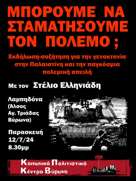 Το Κοινωνικό Πολιτιστικό Κέντρο Βύρωνα σας καλεί την Παρασκευή 12/7/24, στις 8.30μμ στην Λαμπηδόνα (άλσος Αγ. Τριάδας Βυρωνα) σε εκδήλωση-συζήτηση με θέμα "Μπορούμε να σταματήσουμε τον πόλεμο;". Κεντρικός ομιλητής: Στέλιος Ελληνιάδης.
