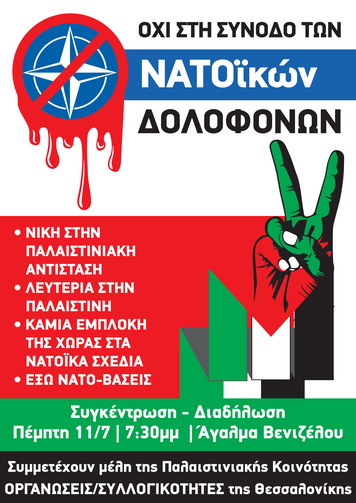 Η πάλη ενάντια στον πόλεμο σημαίνει αγώνα ενάντια στο ΝΑΤΟ. Mόνο οι λαοί και το κίνημα τους μπορούν να βάλουν φραγμό τόσο στα σχέδια πολέμου, όσο και στις επιδιώξεις των μεγάλων ιμπεριαλιστικών δυνάμεων για ξαναμοίρασμα του κόσμου, των αγορών και των σφαιρών επιρροής. Η αντιϊμπεριαλιστική διεθνιστική πάλη έχει σήμερα σαν προμετωπίδα της των αγώνα των Παλαιστινίων. Η αποφασιστική παλαιστινιακή αντίσταση απέναντι στην εθνοκάθαρση και οι μαζικές διαδηλώσεις αλληλεγγύης έχουν ήδη βάλει πολλά εμπόδια στους στόχους του Ισραήλ και των ΗΠΑ-ΝΑΤΟ-ΕΕ. Η απάντηση του σιωνιστικού κράτους είναι η κλιμάκωση της γενοκτονίας, ενώ οι ιμπεριαλιστές προστάτες του δεν διστάζουν να απειλούν τους λαούς ότι θα γίνουν κρέας για τα κανόνια και τα συμφέροντά τους. Το εργατικό και λαϊκό κίνημα θα δώσει την μάχη να μπλοκάρει και να ανατρέψει την πορεία προς τον πόλεμο. Η νίκη του παλαιστινιακού λαού θα είναι νίκη για κάθε λαό, για κάθε εκμεταλλευόμενο και καταπιεσμένο άνθρωπο. Συνεχίζουμε μέχρι την νίκη, συνεχίζουμε για ΛΕΥΤΕΡΙΑ στην ΠΑΛΑΙΣΤΙΝΗ! ΚΑΜΙΑ ΕΜΠΛΟΚΗ ΣΤΑ ΣΦΑΓΕΙΑ ΤΟΥ ΝΑΤΟ!
