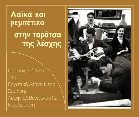 ΛΑΪΚΆ και ΡΕΜΠΕΤΙΚΑ στην Ταράτσα της Εργατικής Λέσχης Νέας Σμύρνης την ΠΑΡΑΣΚΕΥΗ 12/7 στις 9.30μμ.