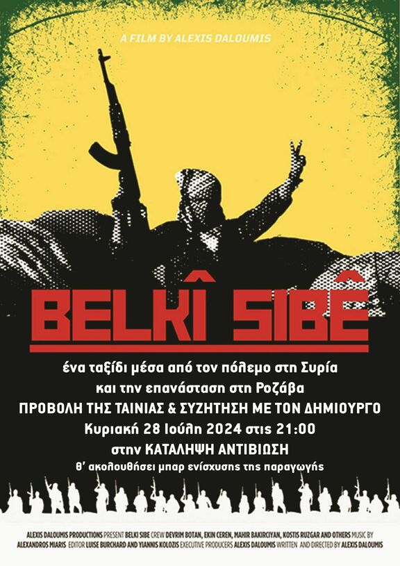 Προβολή της ταινίας Belkî Sibê (Ίσως αύριο) του Αλέξη Νταλούμη για τον πόλεμο στη Συρία και την επανάσταση στη Ροζάβα. Θα ακολουθήσει συζήτηση με τον δημιουργό και μπαρ οικονομικής ενίσχυσης της παραγωγής (θα υπάρχει και κουτί οικονομικής ενίσχυσης). Κυριακή 28 Ιούλη στις 21:00 στην αυλή της Αντιβίωσης.