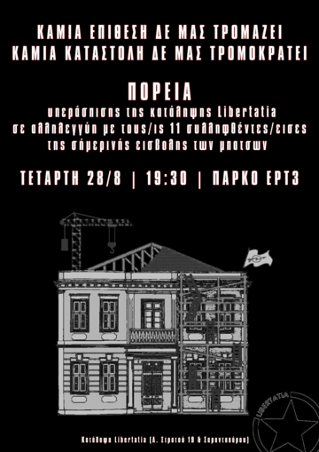 Παράλληλα με τις δολοφονίες μεταναστών στα σύνορα, τις ατελειώτες καμμένες εκτάσεις δασών, την οικονομική και κοινωνική εξαθλίωση της κοινωνικής βάσης και λίγο πριν την έναρξη της ΔΕΘ και τα εγκαίνια του νέου κύκλου κρατικής και καπιταλιστικής βαρβαρότητας, το κράτος επιλέγει να χτυπήσει και να εκκενώσει την εδώ και 16 χρόνια κατειλημμένη Libertatia. Είναι συνολικά η τέταρτη εισβολή στο κτίριο της Libertatia μετά τον εμπρησμό της από φασίστες στις 21/1/2018, με το συνολικό αριθμό των συλλήψεων να φτάνει τις 27, ενώ δεν έχει ούτε μια για τα φασιστοειδή που την έκαψαν . Το κράτος σε ένα κατασταλτικό μπαράζ εδώ και αρκετούς μήνες προσπαθεί να σβήσει τους κινηματικούς χώρους και τις δομές αγώνα που αντιστέκονται απέναντι σε ένα σάπιο και χρεωκοπημένο σύστημα.