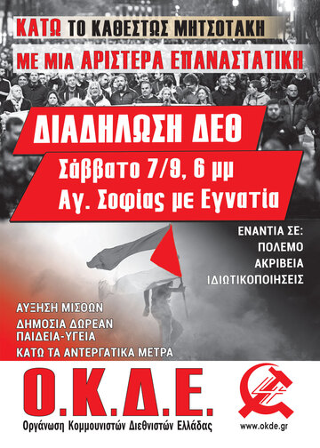 Το ΕΕΚ-Τροτσκιστές, καλεί την εργατική τάξη, τη νεολαία και τους καταπιεσμένους, να πάρουν μέρος στη φετινή αντικυβερνητική διαδήλωση στη ΔΕΘ, παλεύοντας ανεξάρτητα και σε σύγκρουση με την κρατική συνδικαλιστική γραφειοκρατία των ΓΣΕΕ και ΑΔΕΔΥ, αλλά και το μαχητικό "εντός ορίων" ρεφορμισμό του ΠΑΜΕ, στην προοπτική της Γενικής Πολιτικής Απεργίας Διαρκείας και της εργατικής εξουσίας. Οργανωθείτε στο ΕΕΚ, για την επαναστατική ηγεσία στο εργατικό κίνημα και το χτίσιμο του Επαναστατικού Κόμματος της εργατικής τάξης και την επαναστατική Διεθνή, την Τέταρτη Διεθνή! Για την ήττα του ΝΑΤΟ στον ιμπεριαλιστικό πόλεμο στην Ουκρανία! Νίκη της Παλαιστινιακής επανάστασης, με τη συντριβή του σιωνισμού και των ιμπεριαλιστών, για μια ελεύθερη σοσιαλιστική Παλαιστίνη, από τον Ιορδάνη ως τη Μεσόγειο, όπου Άραβες και Εβραίοι θα ζουν μαζί, στη Σοσιαλιστική Ομοσπονδία των Λαών της Μέσης Ανατολής! Εμπρός στους δρόμους, της επαναστατικής σοσιαλιστικής ανατροπής, στην Ελλάδα, την Ευρώπη και όλο τον κόσμο, με την κόκκινη διαρκή επανάσταση, για τον παγκόσμιο ελευθεριακό κομμουνισμό!