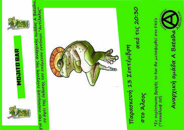 Την Παρασκευή 13.09 από τις 8μιση στο Άλσος, θα πραγματοποιηθεί μπαρ οικονομικής ενίσχυσης της αναρχικής ομάδας A Batalha, εν όψει της έκδοσης του επόμενου εντύπου "Αντίλαλος"