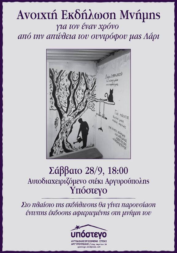 Το Σάββατο 28 Σεπτέμβρη, στις 18:00, στο Αυτοδιαχειριζόμενο Στέκι Αργυρούπολης Υπόστεγο θα γίνει Ανοιχτή Εκδήλωση αφιερωμένη στη μνήμη του Λάρι. Στο πλαίσιο της εκδήλωσης θα παρουσιαστεί έντυπη έκδοση που είναι αφιερωμένη στη μνήμη του.